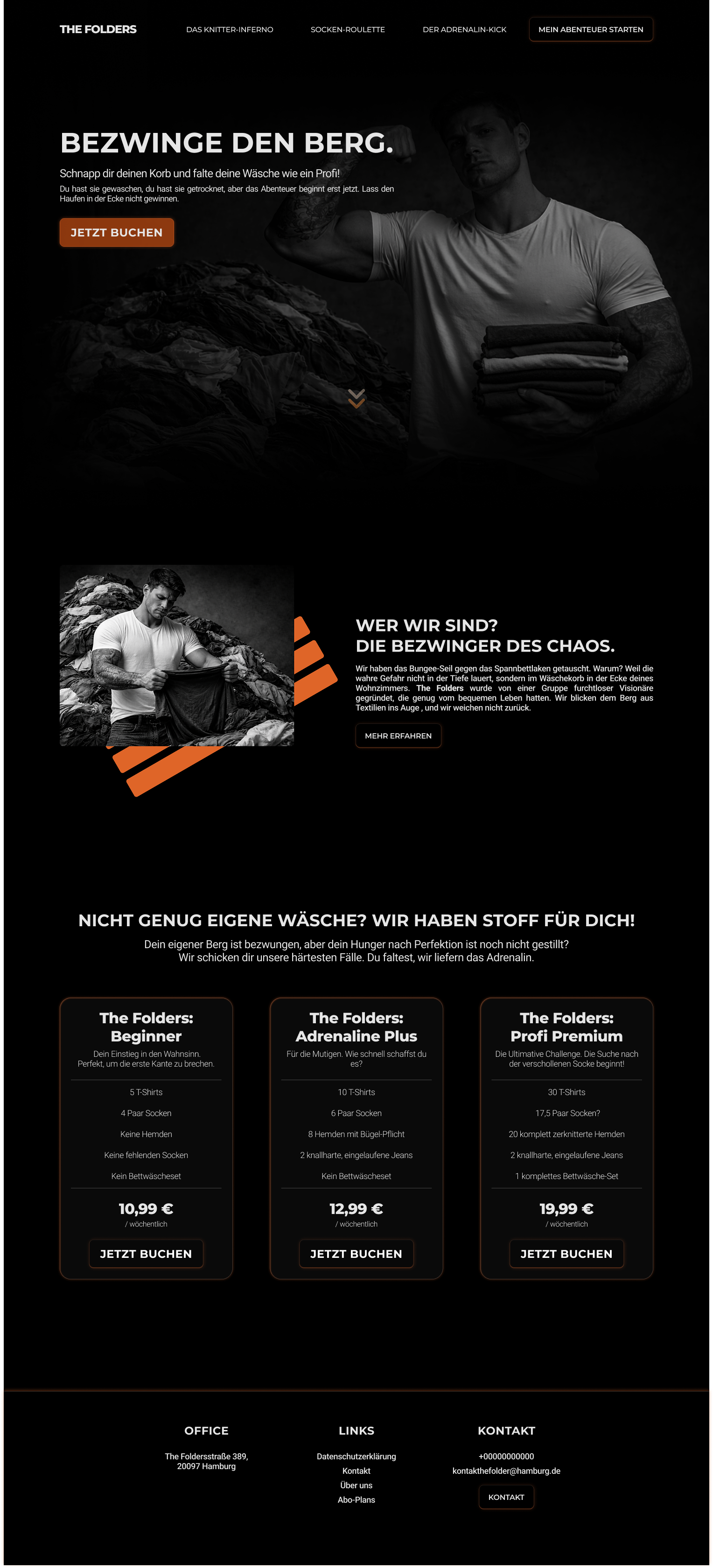 Using a dark, high-contrast aesthetic typical of extreme sports and fitness brands, I transformed folding clothes into a heroic feat. The project features aggressive typography, dramatic black-and-white imagery, and a "subscription model" for those who don't have enough of their own laundry to conquer. Originally a 2-hour task to design a hero section, I expanded the scope to include an "About Us" section and pricing tiers to fully flesh out the satirical brand identity.